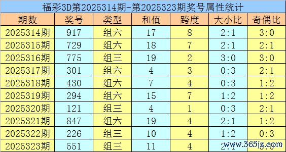 开奖总结:福彩3D第2025323期开出奖号551。奖号方法为组三,奇偶比为3:0,012路比为0:1:2,大小比为2:1,和值为11,跨度为4。